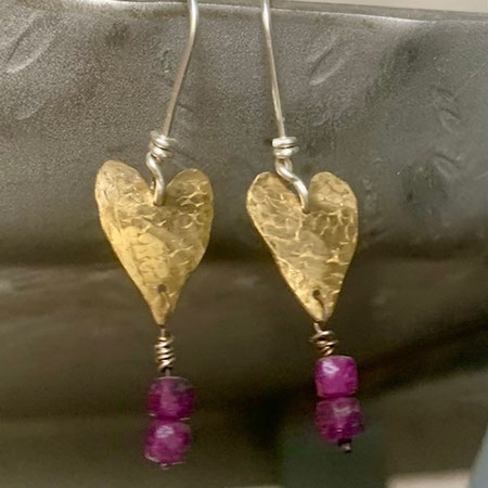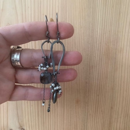 Oxidiertes Sterlingsilber bildet den Ohrhaken, die Steinfassung und den Perlendraht. Die hintere Fassungswand besteht aus Messing. Sie hat eine sternförmige Aussparung, sodass von hinten Licht durch den funkelnden Erdbeerquarz fallen kann.